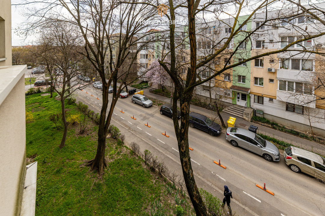 Suprafața utilă este de 60,59 mp, la care se adaugă un balcon închis de 4,5 mp, cu vedere către copacii din fața blocului și strada Cosminului.