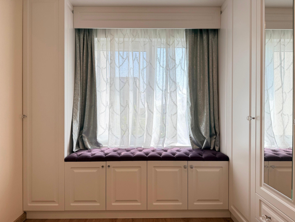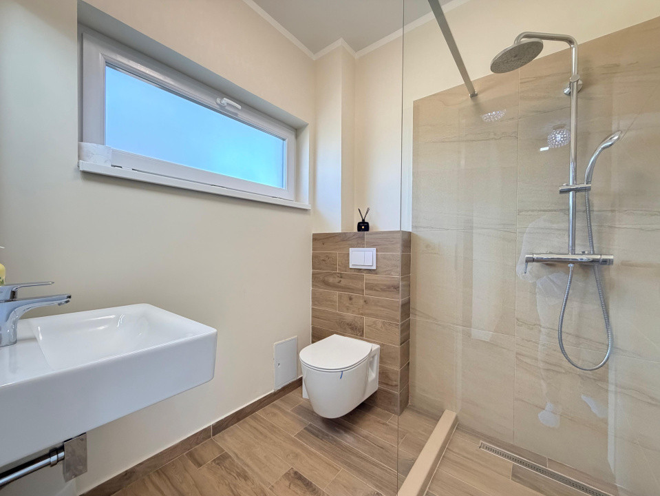 * Etaj: hol cu spații de depozitare, dormitor principal cu ieșire pe balcon, dormitor secundar amenajat ca dressing, baie cu cadă