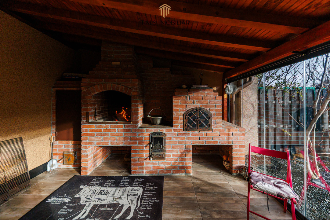 Un element aparte al proprietății îl reprezintă zona de terasă și gătit în aer liber, concepută ca un spațiu dedicat întâlnirilor cu familia și prietenii. Aici găsim un grătar zidit cu afumătoare, loc pentru ceaun, cuptor pentru pâine, blat de lucru generos, chiuvetă cu apă curentă și spații pentru depozitare. Zona este completată de frigider și televizor, transformând terasa într-un loc foarte plăcut pentru serile petrecute afară.