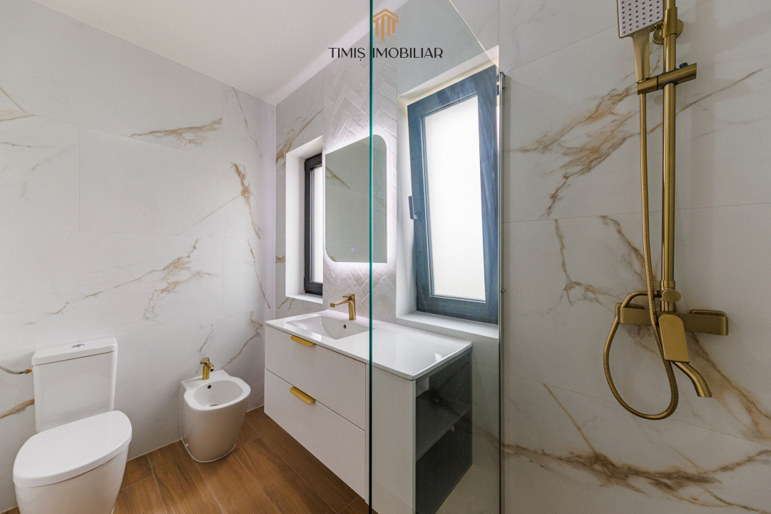 Etaj: dormitor matrimonial cu baie proprie și dressing, două dormitoare secundare (unul nemobilat, adaptabil: birou, cameră copil, dressing etc.), baie cu cadă