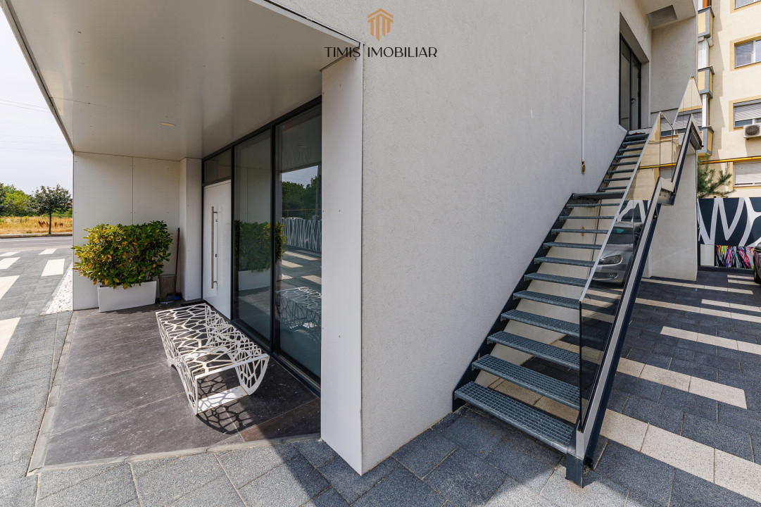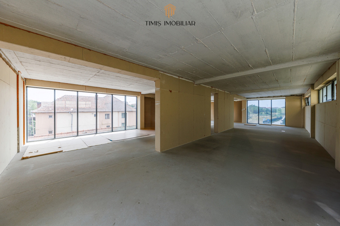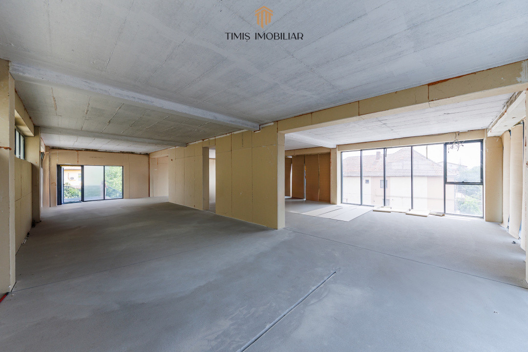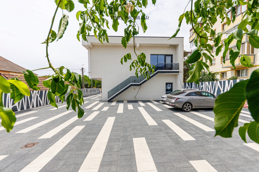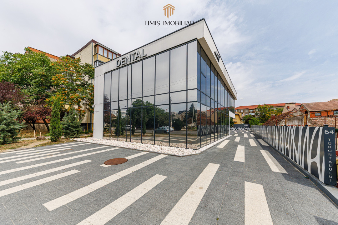 Etajul unei clădiri comerciale noi, cu acces facil și parcare generoasă. La parterul imobilului funcționează deja un cabinet stomatologic cunoscut în Timișoara – un reper important în zonă.